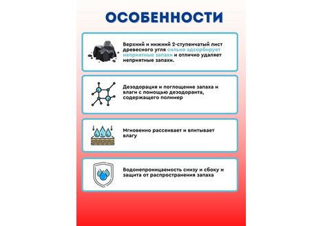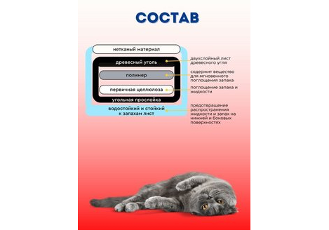 Дезодорирующая подстилка, которая не требует замены около 1 недели, впитывает мочу, а антибактериальные компоненты надежно устраняют неприятный запах на 99.9%.