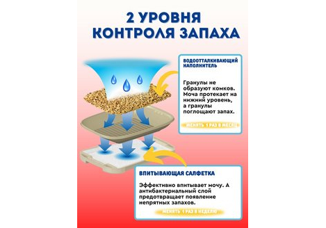 Дезодорирующая подстилка, которая не требует замены около 1 недели, впитывает мочу, а антибактериальные компоненты надежно устраняют неприятный запах на 99.9%.