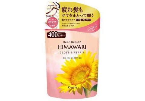 KRACIE Dear Beaute Himawari Gloss & Repair Шампунь с растительным комплексом для восстановления блеска поврежденных волос, с цветочным ароматом и нотками персика, мангустина и муската, сменная упаковка 400мл.