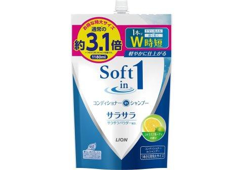 LION Шампунь с кондиционером "Смягчение" для сухих волос с фруктово-цитрусовым ароматом "Soft in 1" 1180 мл, мягкая упаковка с крышкой