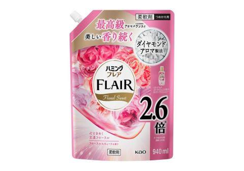 KAO Кондиционер-смягчитель для белья Flair Floral Sweet со сладким цветочным ароматом и нотками персика и ванили, сменная упаковка с крышкой 940мл.