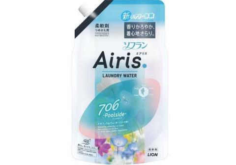 LION Прозрачный кондиционер для белья "Soflan Airis" с воздушным ароматом «Poolside» (мужской аромат) 850 мл, мягкая упаковка с крышкой